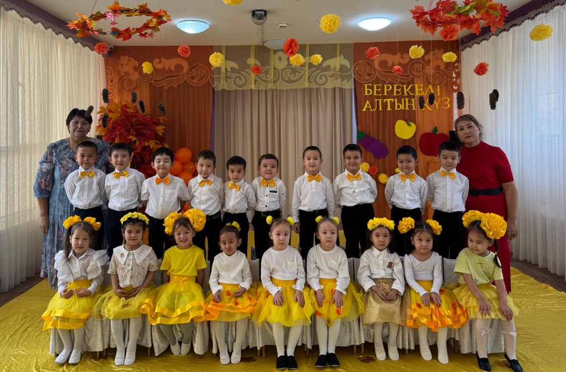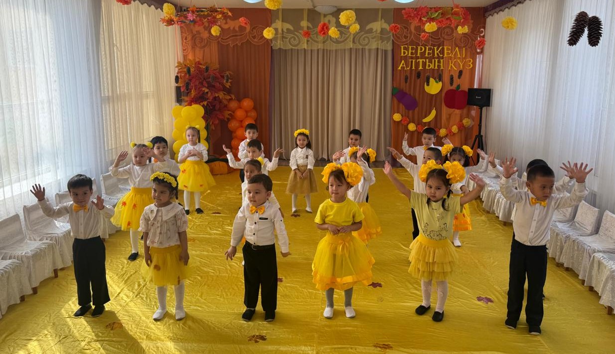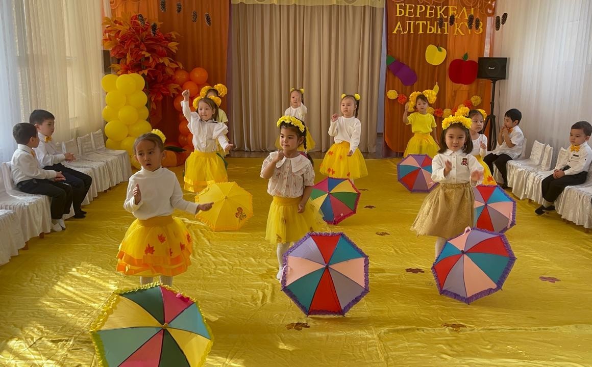 Мақсаты: Мерекелік көңіл-күй орнату. Күз мезгілінің ерекшелігін көрсету арқылы балалардың ой-өрісін,тілін, сөйлеу мәнерін дамыту. Балалар ән айтып, би билеу барысында өзін ұқыпты ұстауға тәрбиелеу.